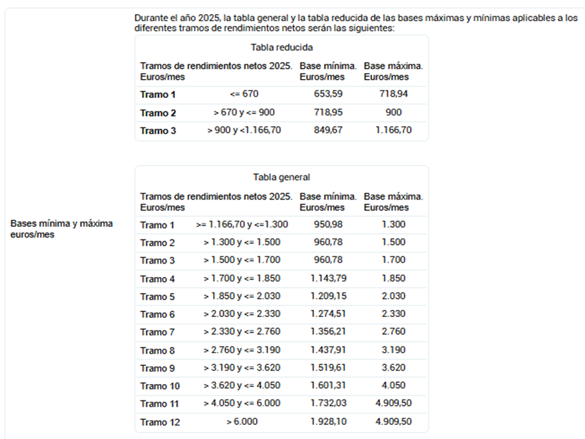 Como cada año, recordamos que es “recomendable” actualizar sus bases de cotización en base a sus ingresos reales, en caso contrario el ajuste lo realizará de oficio la Administración una vez hayan presentado su declaración de RENTA. Le recordamos las tablas aplicables 2025: